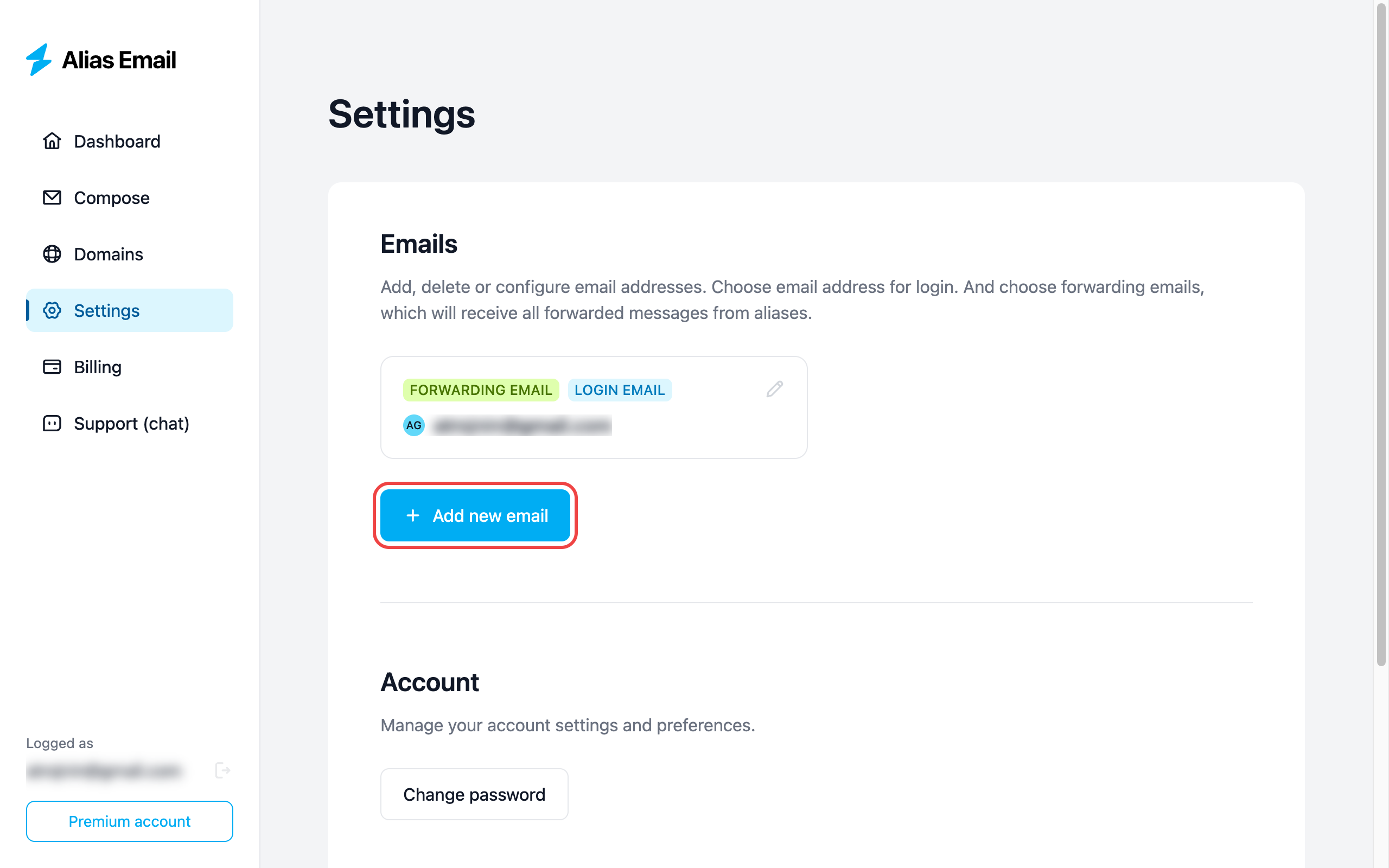 Open Settings. The "Emails" section lists every address attached to your account. Click "Add new email" to attach another one.