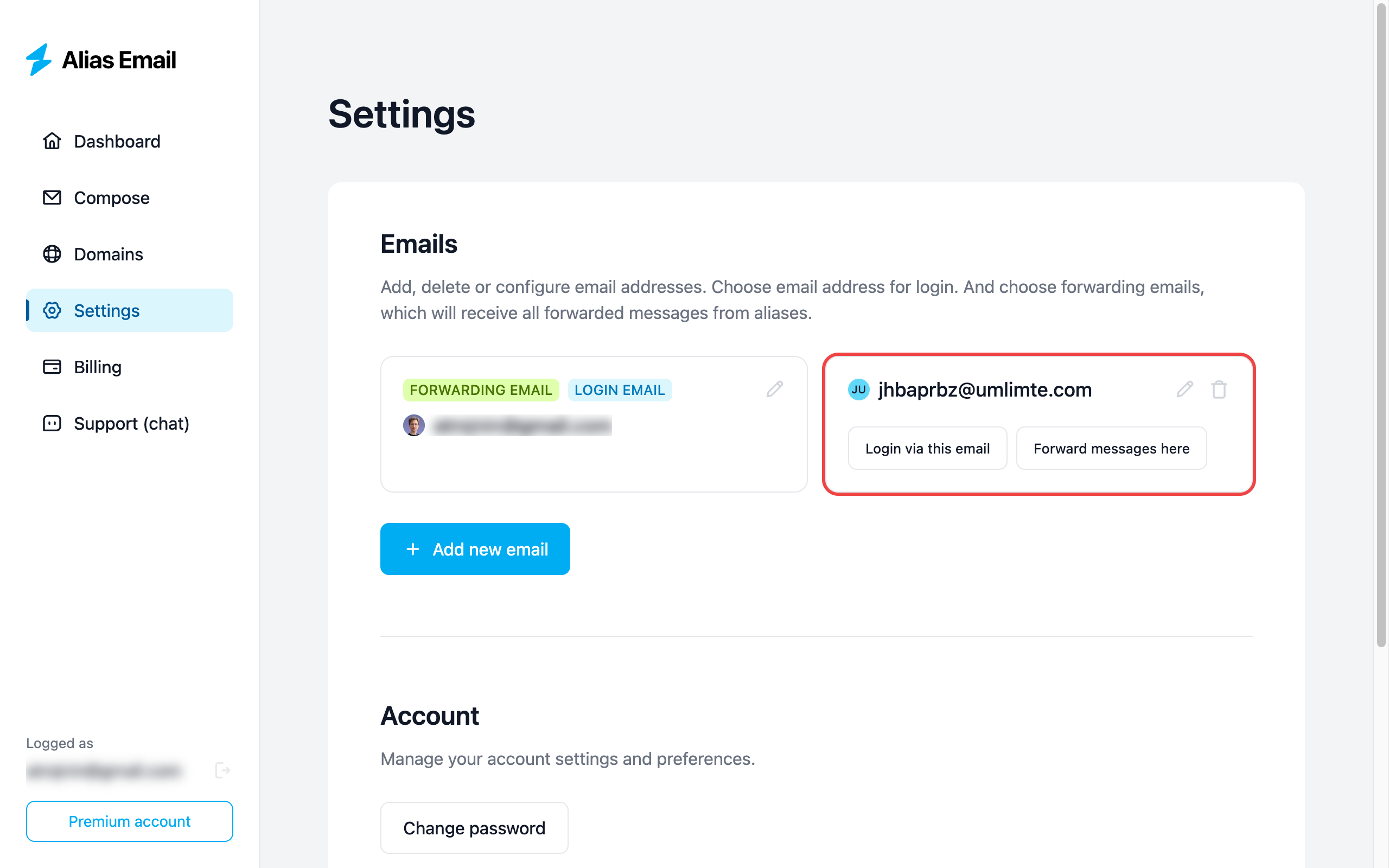 The new email shows up in Settings with an unconfirmed status. Open the inbox of the address you added — there'll be a confirmation message from Alias Email. Click the link inside to verify ownership.