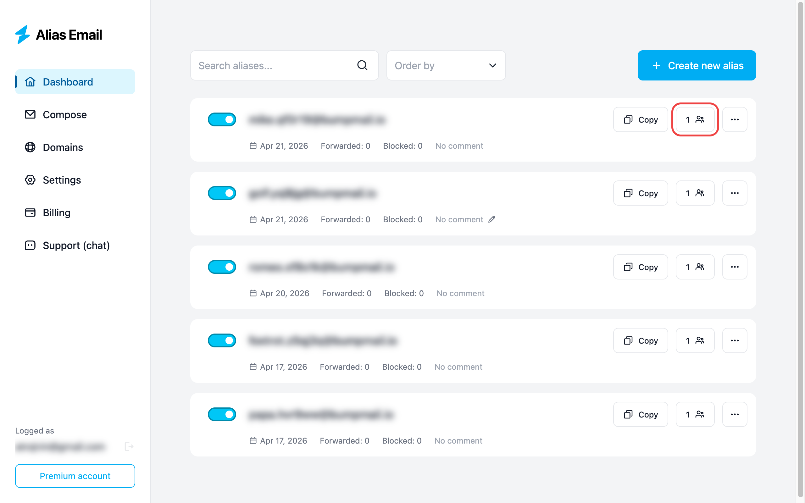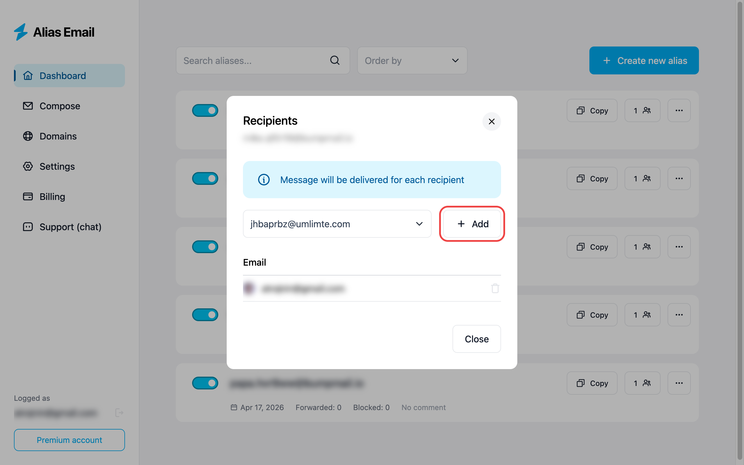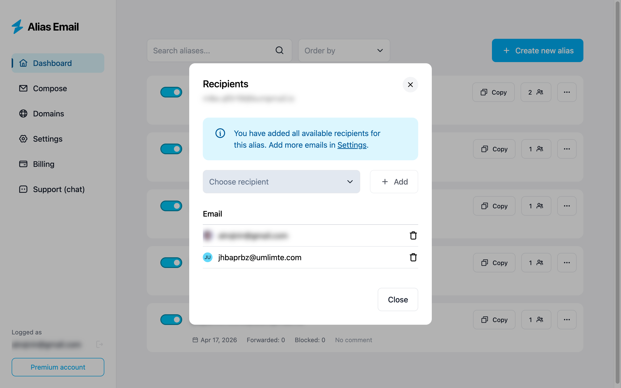 By default, each alias forwards messages to your primary email address. With a premium plan, you can add multiple recipients to any alias — so the same incoming message gets delivered to several inboxes at once.Prerequisites
